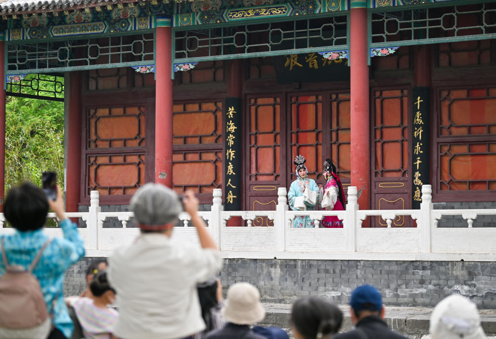 2025年5月5日,观众在天津人民公园欣赏戏曲《西厢记》演出。