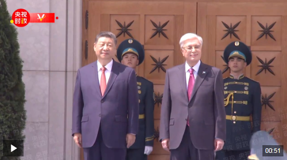 习近平抵达阿斯塔纳纳扎尔巴耶夫国际机场时,托卡耶夫总统率总统办公厅主任达杰拜、副总理兼外长努尔特列乌、总统外事顾问卡济汉、阿斯塔纳市长卡瑟姆别克等高级官员热情迎接。身着盛装的哈萨克斯坦女青年向习近平献花。礼兵分列蓝地毯两侧致敬,哈萨克斯坦少年儿童手持中哈两国国旗热烈欢迎习近平到访。习近平在托卡耶夫陪同下观看仪仗队分列式,直升机悬挂中哈国旗从机场上空飞过。在机场贵宾楼内,两国元首还共同欣赏哈萨克斯坦少年儿童的文艺表演。