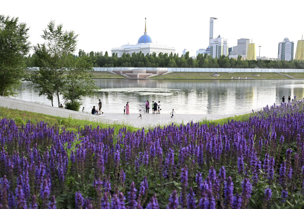 6月13日,人们在哈萨克斯坦首都阿斯塔纳的伊希姆河畔休闲。新华社记者 燕雁 摄