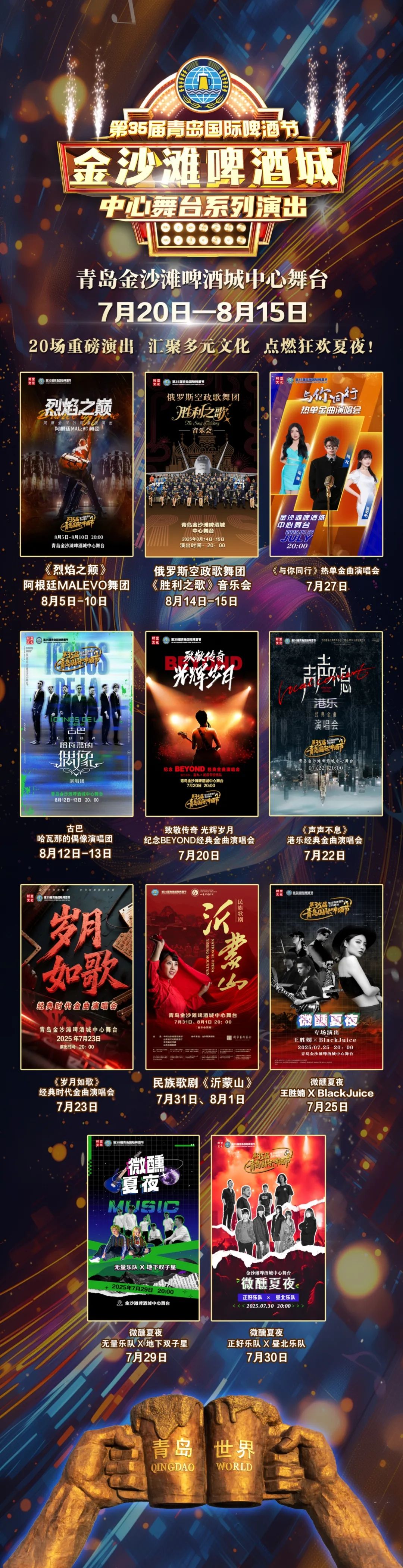 除以上演出外,8月3日的演出内容正在筹备排档中,后续将通过【青岛国际啤酒节官方账号】【金沙滩啤酒城官方账号】等权威渠道,第一时间向社会公布详细演出信息,敬请持续关注。