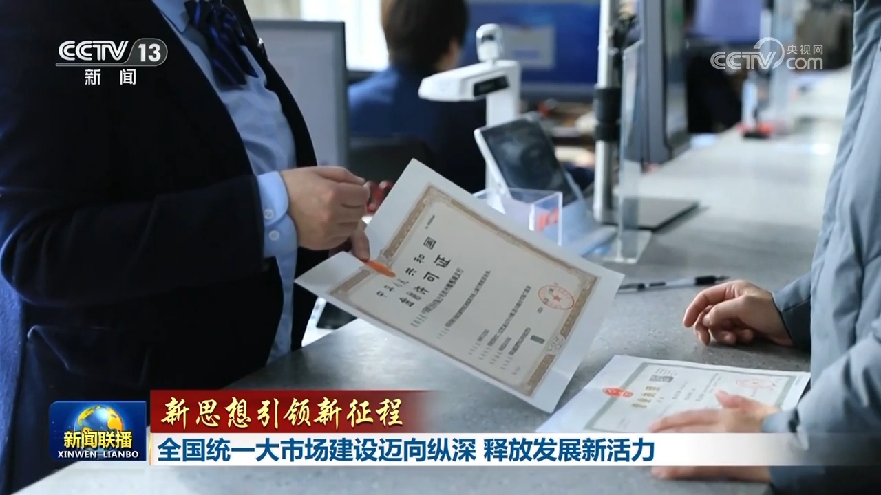 央视网消息(新闻联播):习近平总书记指出,构建新发展格局,迫切需要加快建设高效规范、公平竞争、充分开放的全国统一大市场,建立全国统一的市场制度规则,促进商品要素资源在更大范围内畅通流动。当前,全国统一大市场建设向纵深推进,制约经济循环的关键堵点加速打通,市场体系基础制度更加健全,为经济高质量发展注入强劲动能。