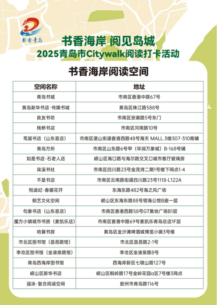 本次青岛市Citywalk阅读打卡活动,以“走读”为核心,用Citywalk的形式串联起岛城的19家书香海岸阅读空间,将城市探索与深度阅读进行有机结合,解锁集阅读、学习、创作、社交于一体的城市漫游体验。参与者沿着青岛的书香海岸行走,在红瓦绿树、碧海蓝天的环绕中,邂逅书店、图书馆等多元阅读空间,在纸质书页的沙沙声中,重拾传统阅读的独特魅力。
