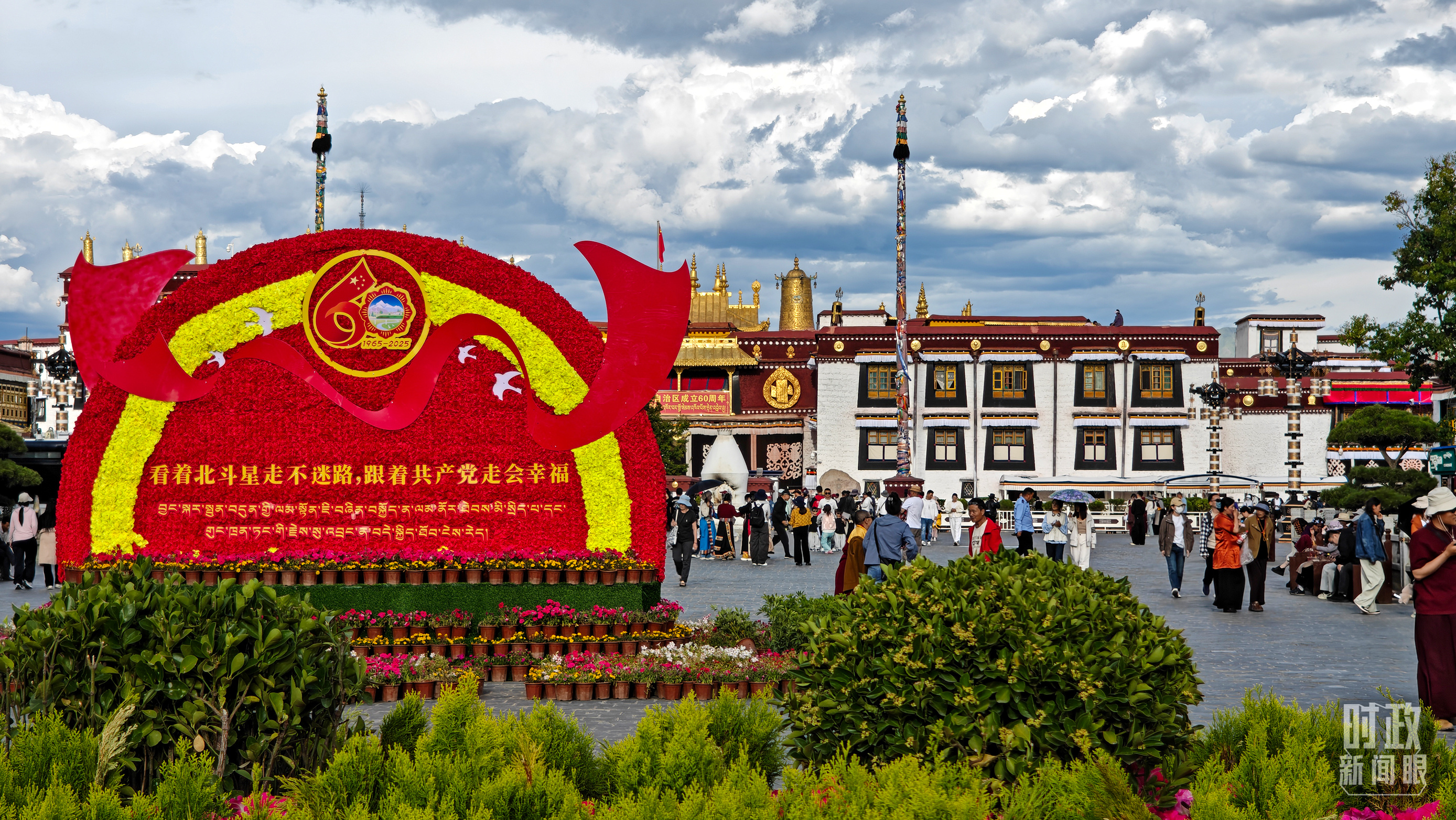 △拉萨街头庆祝西藏自治区成立60周年的巨型横幅。(总台央视记者曹亚星拍摄)