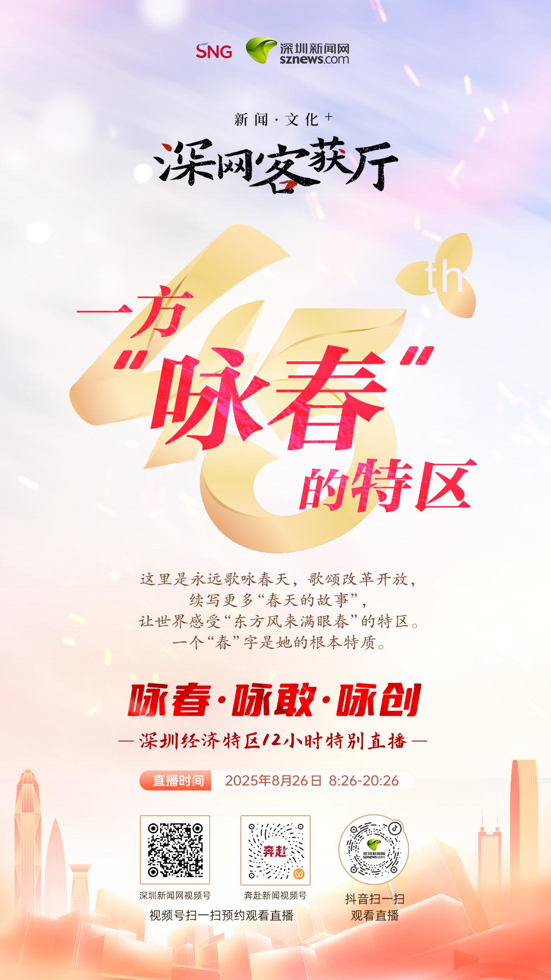 直播将紧扣“咏春・咏敢・咏创”这一主题,通过三大章节,对知名企业家、特区创业者、特区建设者以及资深媒体人和专家学者进行访谈,同时采取现场连线的方式,对于深圳经济特区标志性场景进行展现。通过历史回溯、主题挖掘和现场展示,多角度多层次地呈现深圳经济特区的发展之脉、动力之源以及精神之核。