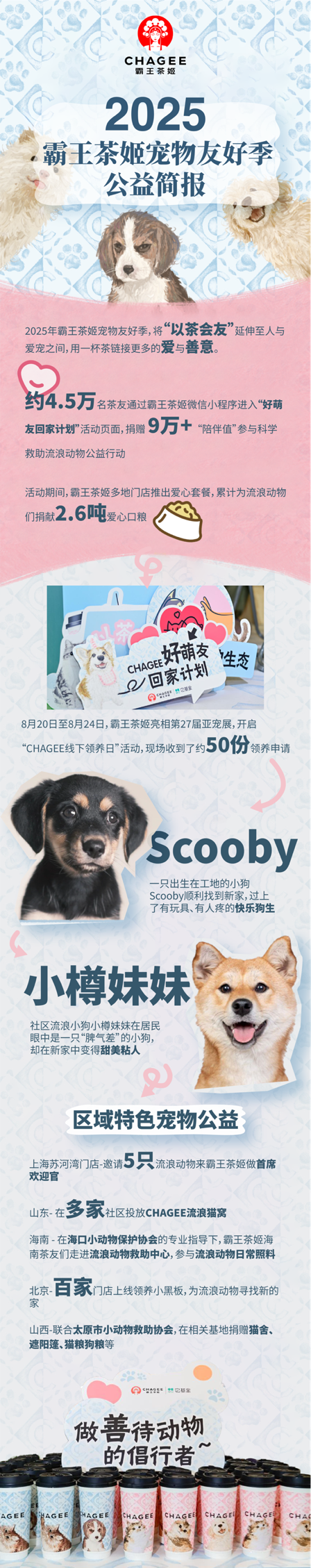 自2017年成立以来,霸王茶姬将“用一杯茶,链接每人每天”作为企业使命。此次宠物友好季,霸王茶姬让每一杯茶都承载关怀与温度。从线上小程序捐赠到线下领养与实地支援,每一份努力都让流浪动物获得切实帮助,也让更多人感受到“以茶会友”的善意力量。未来,霸王茶姬将持续探索“茶+公益”的创新模式,把人与人、人与宠物之间的温暖链接变成可持续的社会价值,让爱与善意在每一次相遇中延续。