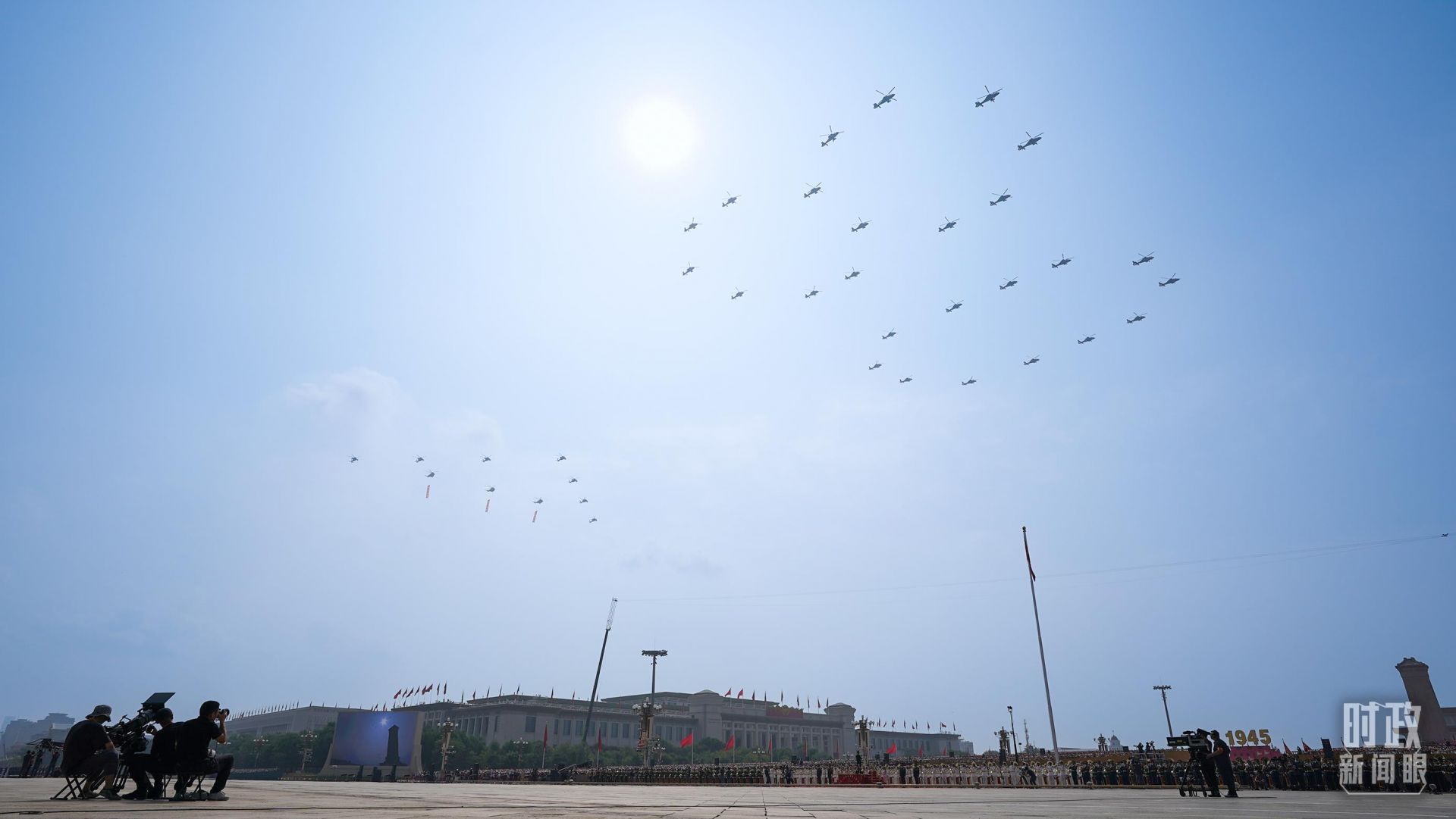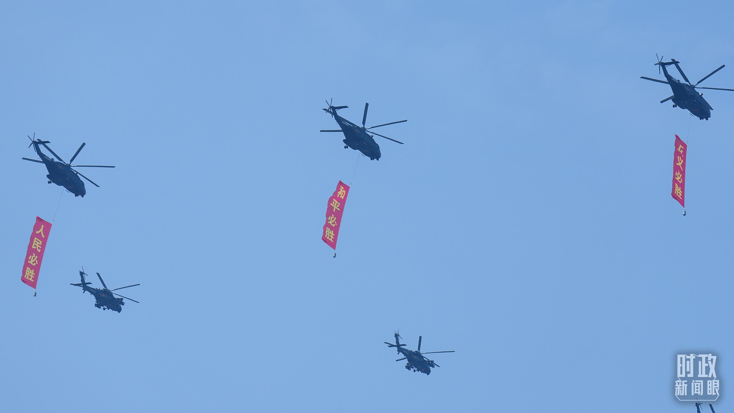 △9月3日,3架直升机分别悬挂“正义必胜”“和平必胜”“人民必胜”条幅飞过天安门广场。(总台记者 李晋 拍摄)