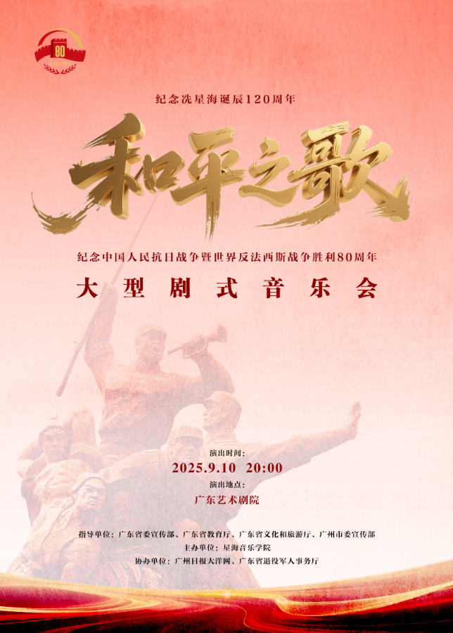 为隆重纪念中国人民抗日战争暨世界反法西斯战争胜利80周年、人民音乐家冼星海诞辰120周年,学校将于2025年9月10日(星期三)晚8时在广东艺术剧院举办大型剧式音乐会——《和平之歌》。
