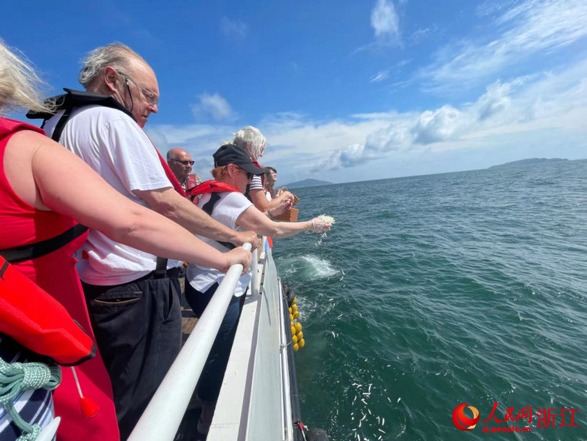 “里斯本丸”号船英军战俘后人将白色花瓣撒向蔚蓝的大海。人民网记者 王丽玮 摄