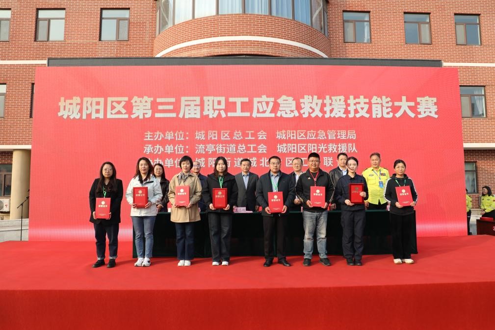大赛在城阳街道城北片区工会联合会共享职工之家举办,设置初起火情扑灭、火场救援、医疗急救三大项目,涵盖理论考试与实操考核,全面检验应急处置能力。