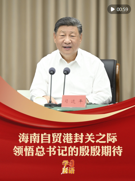 12月18日,海南自由贸易港正式启动全岛封关。建设海南自由贸易港,是习近平总书记亲自谋划、亲自部署、亲自推动的改革开放重大举措。封关之际,让我们领悟习近平总书记的殷殷期待,为把海南自由贸易港打造成为引领我国新时代对外开放的重要门户加油。